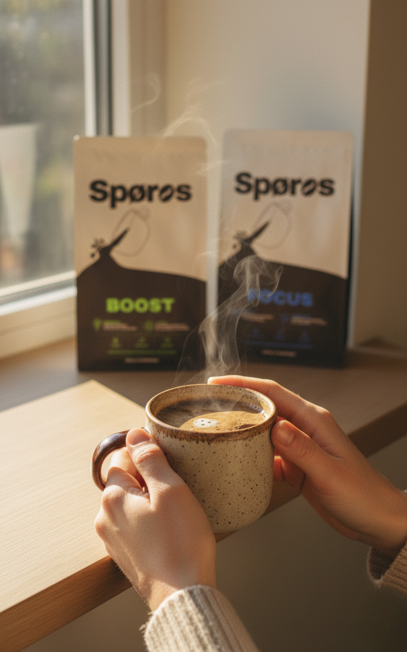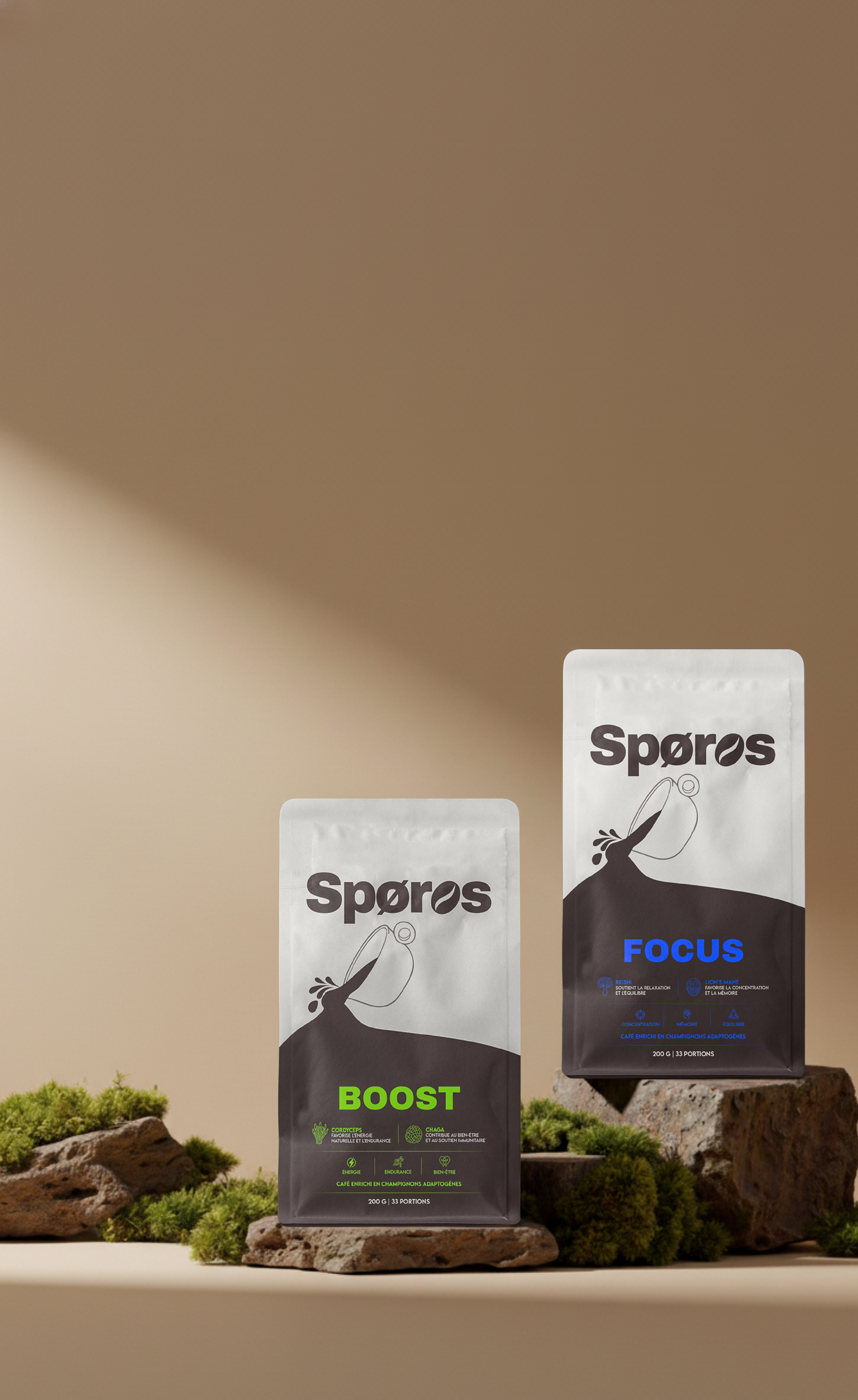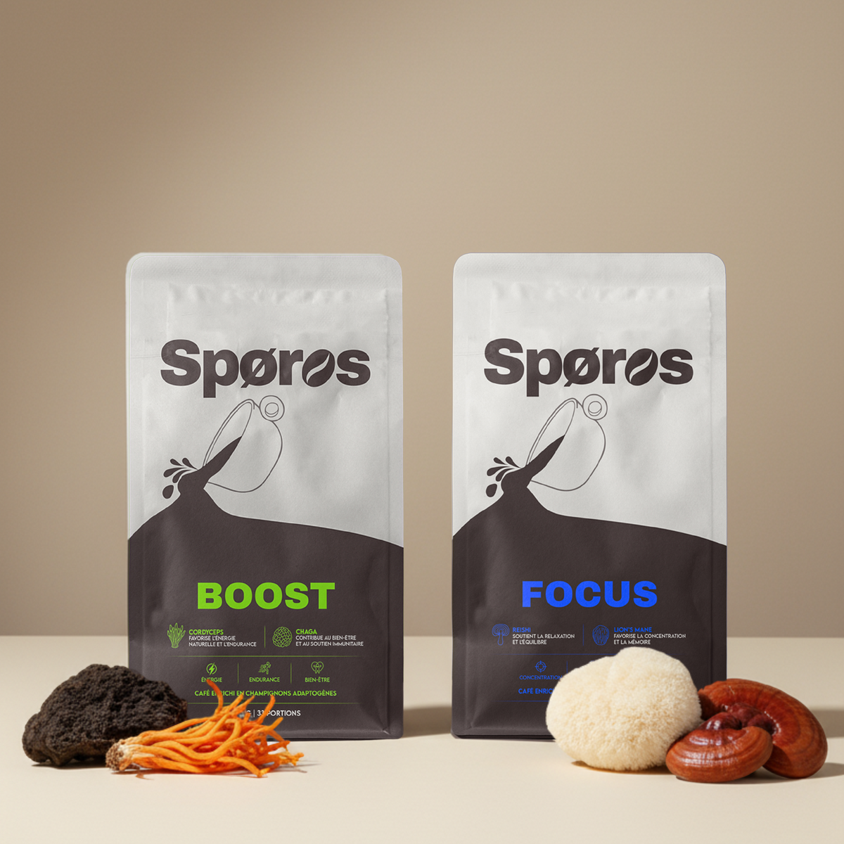 Avec 1200 mg d’extraits concentrés de champignons adaptogènes et environ 2x moins de caféine qu’un café classique, Spøros apporte une stimulation plus douce mais plus régulière : assez pour rester focus et motivé, sans le tremblement ni le “crash” qui suivait parfois votre café habituel.